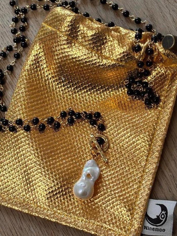 Ninemoo Gold & Black Bead Long Necklace with drop pearl