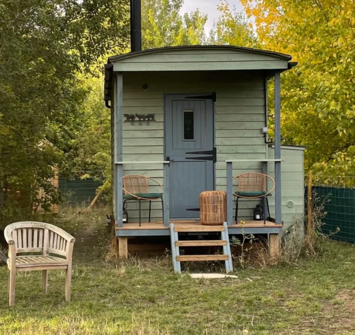Inside you’ll find a small sink, portable gas stove, kettle, crockery and cutlery, along with fresh drinking water, tea and coffee, and a cool box. Outside, enjoy alfresco cooking on the fire pit, two picnic tables, and a peaceful outdoor setting. A hot shower (using collected rainwater) and a nearby composting toilet complete the experience.