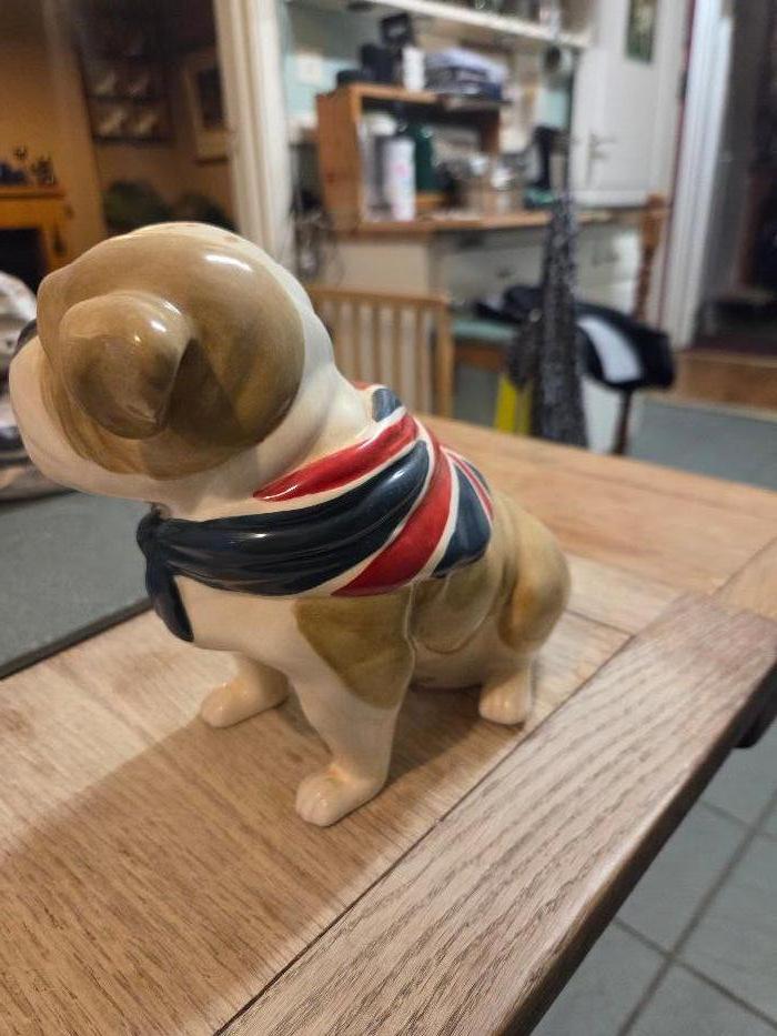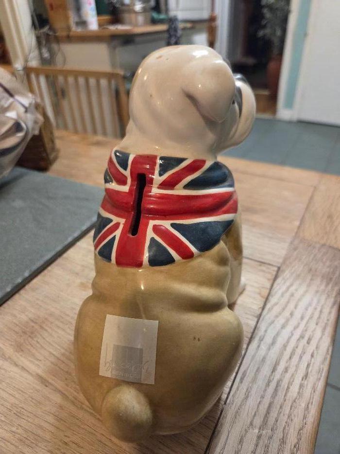 Bulldog in union jack bandana money box with plug in base, approximately 7" high PLUS £4.00 POSTAGE