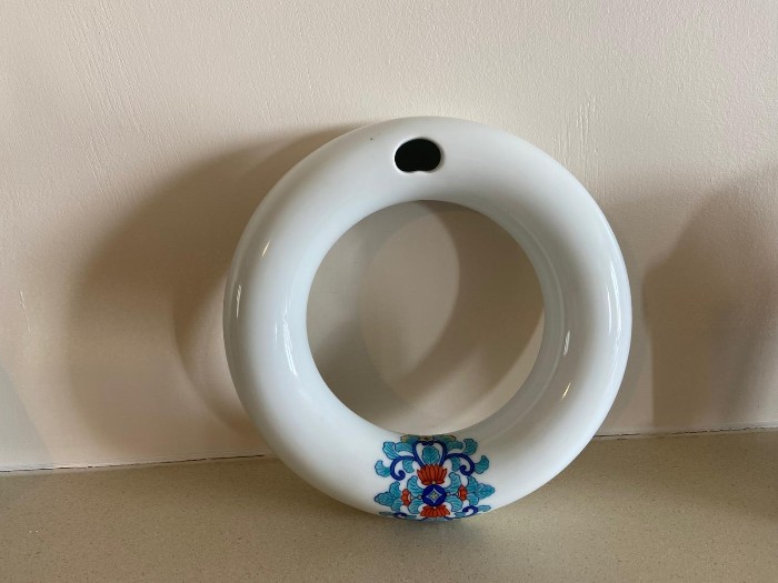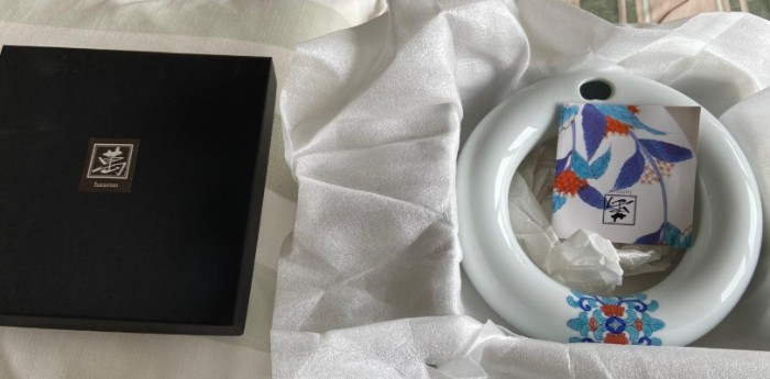 An unusual and beautiful Japanese round vase for a single bud. Made by Hataman, Kaleidoscope pattern, unused, in a presentation box. 20cm diameter. Retail value £49.