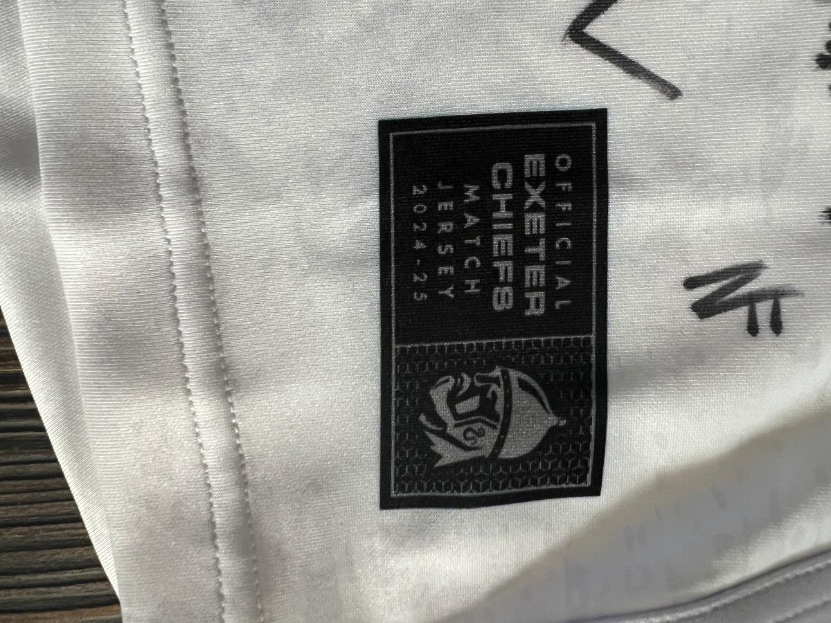 Authentic, signed Exeter Chiefs rugby shirt. The shirt is a white away jersey (24-25), emblazoned with the club's signature logo, the Sika branding, and sponsors' logos including Samurai, Gallaghers, and Boden Group.