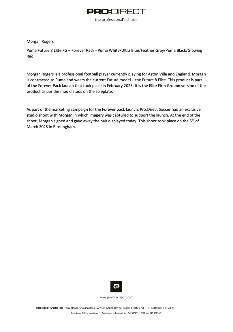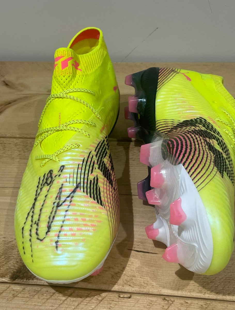 These Puma football boots were signed by Morgan Rogers during a private signing session on March 5th, 2025. The boots come with an official Pro:Direct Certificate of Authenticity, which serves as your proof that the signature is 100% genuine.