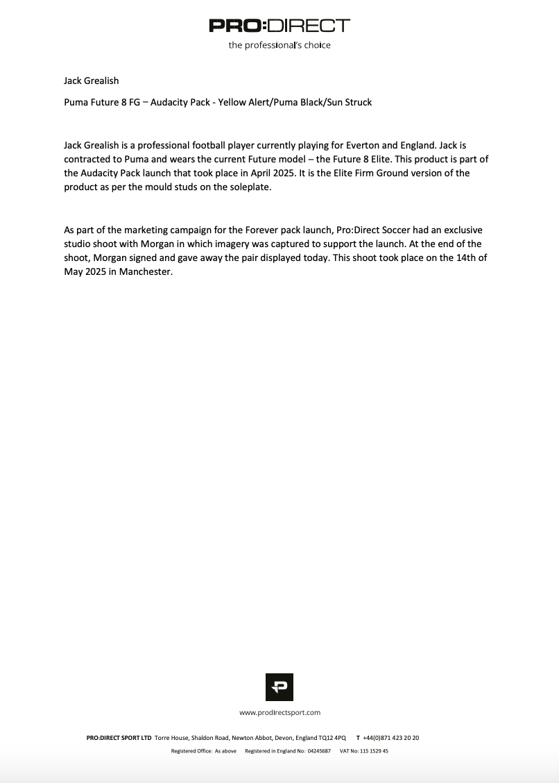 These Puma football boots were signed by Jack Grealish during a private signing session on May 14th, 2025. The boots come with an official Pro:Direct Certificate of Authenticity, which serves as your proof that the signature is 100% genuine.